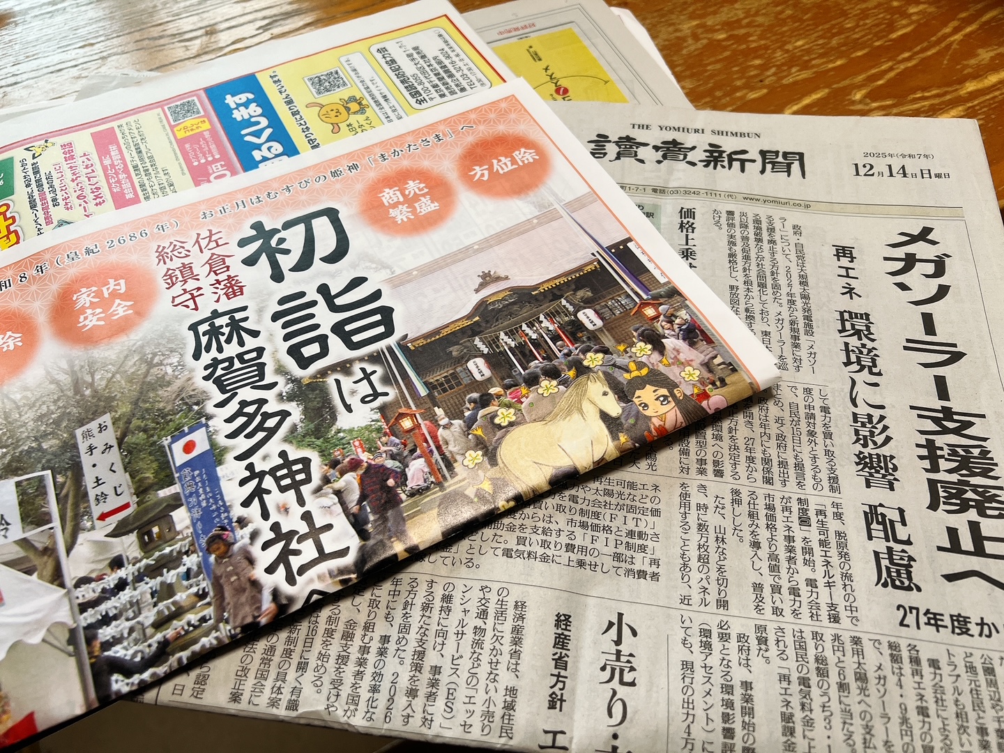 冷たい北西の風が止んだと思ったら、昨夜半から冷たい雨が降り始めた佐倉です。 その昨夜は、麻賀多神社大神輿奉昇員である鏑木青年会役員の忘年会が食い処あだちで開催され、宮司が参加してまいりました。 兎に角、今年10月に齋行した麻賀多神社例大祭での大神輿渡御に対して、広い方面より今年の渡御はここ数年で一番良かったと、お褒めの言の葉を頂戴しており、来年もそれに負けない渡御をするとの心意気を青年会役員各位より感じました。 この段階で午後9時。実はこの次がありまして、お祭りに欠かせないのがお囃子。佐倉囃子保存会の稽古納めと忘年会が、仲町のおはやし館で行なわれており、あだちからハンドルキーパーの青年会員に送って貰い、中締めの少し前に到着。 挨拶の後に何度目だろうという乾杯をして、そこからビンゴ大会で賞品を頂きました。 神社からは賞品としてお米2キロを差上げていましたが、ビンゴの賞品にはならずにいつの間にか設定されていた「宮司とじゃんけん大会」で、最後までじゃんけんに勝った方に贈呈。 それだけではと、翌日(今日)に社務所に来てくれたら、お米5キロを追加でプレゼントと言ったら、おはやし館2階は割れんばかりの拍手でした。 いつものこと乍ら、このような楽しい席のオササは残りませんで、今朝も冷たい雨は降ってはおりましたが、気分良く朝拝に昇殿しました。 今日は新社務所に冷蔵庫2台と洗濯機を搬入することになっており、江原淡島神社の前責任役員でもあるオカモトデンキさんが足元の悪い中ではありましたが、搬入と設置作業を行なってくれました。 冷蔵庫は2階の厨房がメインの多機能機で、1階の社務室には従来型を。洗濯機は祭典前に身を清める潔斎室前に設置。 2階に設置するものに関しては、クレーンを使って2階テラスから搬入をしまして、未だ新社務所前の土が締まりきっていないために、クレーンと搭載したトラックが泥濘に填るアクシデントも。 でも流石はプロ。作業の無事な完遂は元より、泥濘の対応とその後の後片付けと清掃も確りとしてくれました。 今の家電ってとことん省エネルギー対応ですね。これは新社務所の照明機器全般にも言えることですが、一昔前のものとは消費電力がまるで違う。 世界では白物家電は韓国や中共のメーカーがシェアを握っていますが、今日見た限りでは日本メーカーの復活も夢ではないと思います。 本日の七峯の締めは、今朝の朝刊に今年も初詣案内を折り込みましたというお話。 今回も読売新聞・朝日新聞・日本経済新聞・毎日新聞(一部)で、佐倉市・四街道市・酒々井町の全域と富里市と印西市の一部に折り込みました。 10月下旬からチラシ印刷と折り込みを請け負って頂いている新東京ADの担当さんと打ち合わせを行ないましたが、年々に新聞購読者数が減少しており、チラシの印刷枚数は同じにしているので。余った分を別媒体を使って配布をしました。 時代に合わせた広報活動をしておりますが、購読者数は減っても紙媒体の新聞が大事だと思います。 同じものが神社の社頭にも置いてありますので、是非お手に取ってみて下さいね。