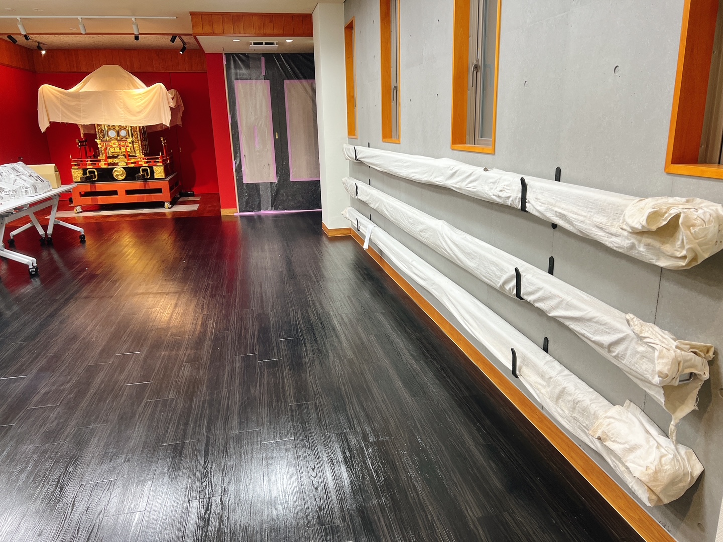 強い北西の風が止んだので、今日は外仕事が捗るぞ!!と気合いを入れた今朝。朝拝で御殿に向かうと、その寒さにビックリ。 綺麗な青空を見て納得がいきました。雲という蓋がないので、地上の夏が上空へ上がる「放射冷却現象」が起きていたんですね。 今日の佐倉、最高級は前日比−6度の5度。最低気温は0度と、昨日より1度低くなりまして、一般家庭の冷蔵庫よりも寒いのです。 その冷蔵庫状態の中にあっても、今日に割り当てた仕事をしませんとお正月を迎えることが出来ません。 巫女さん達は手水舎の水盤に生えた苔の掃除。ちゃんと手袋をやっていたと思いますし、流るる水は「稚珠の水・わくたまのみず」といい、境内から汲み上げている地下水なので水道水よりは温かい。 それでも冷たいですよね。ある程度掃除の目処が立ったら、確りと暖をとらせました。良く頑張ったね。 そして宮司ですが、新社務所建設のために本来の場所から仮移動していたパレットなどの資材を移動して、その場所に降り積もっていた落ち葉をかき集め、そのノリで境内の各所に押しつけてあった落ち葉も掻き出して、大きな山が3つも出来たので、それは明日に全員で片付けます・笑 新社務所の待合室には大神輿が展示されますが、その担ぎ棒3本の仕舞いにどうしようかと考えが及ばない時期がありました。 当社の大神輿は台輪5尺(151?p)で千葉県内最大級。それだけ大きさですので担ぎ棒も長いのです。 担ぎ棒の長さは3間。メートル換算だと5,4メートルありまして、旧神輿倉では奥の収蔵棚から手前へ斜めに立てかけていました。 これだと担ぎ棒の両端にはめている飾り金具が傷んでしまいまして、渡御の後には細心の注意を持って仕舞っていたんですよ。 それを避けるには床面と水平に、そして飾り金具に負荷が掛からないようにしなければなりません。 そこで思いついたのが、大神輿が展示となる待合室の壁面に大型の受けと付けて掛けるという手法なんです。 正式に計った事はありませんが、担ぎ棒自体もかなりの重さがありまして、それに絶えうる金属製の受けは勿論オーダーメイド。 今日はその取り付け作業が行なわれ、計算通り壁面にぴったりと収まり、それ自体も収蔵と言うより展示物の1つになった感があります。 新社務所の内装工事は年明けも続きますが、施行の万葉建設株式会社さんは今日で仕事納め。 現場事務所へ本社から出向している現場監督さんの中には、これから帰省をする方もおりまして、帰省から戻ってきたら初詣に来ますねと。 工事関係の皆さん、お正月休みは十分に身体を癒して頂いて、仕事始めの後は本竣工に向けてまたお励み頂きたく、宜しくお願い致します。 そうそう、今夕は少し早く上がりまして、宮司宅のコンロを掃除。良い薬剤がありますので、ものの数分で焦げ付きのこびりつき汚れも綺麗に落ちました。 綺麗になったコンロ、また美味しいご飯を沢山作って頂きましょう。美味しいご飯は明日への活力ですもんね。