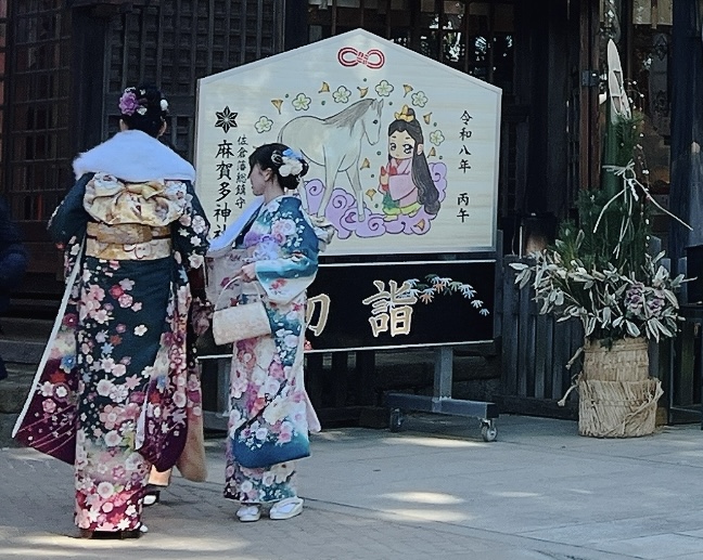 昨夜というか明けというか、何だかんだで今日の午前2時過ぎに就寝をした宮司。昨年末より就寝時間が例年よりかなり遅くなっていますが、これもお陰様で新社務所の部分使用が始まったのが起因なので、良しと致しましょう。 若い頃のように呑みに行っての午前様ではないので、まあ朝の目覚めが宜しい事でして、朝ご飯も美味しく頂ける有り難さを噛み締めております。 昨日までの暴風もどこへやら。気温は低いものの快晴で空気が澄んでおり、朝拝に御殿へ進む参道でした深呼吸は、身体の中に目覚めを起こしてくれました。 今日は成人の日。我が町佐倉でも臼井にある佐倉市民音楽ホールで、市内を3地区に分けて成人式が行われました。 令和4年の民放改正により法律上は18歳をもって成人となりましたが、多くの自治体では20歳をもって成人式を行なっており、式の名称も「20歳の集い」なるところもあるとか。 それはそれて自治体の皆さんが頭を捻って考えついた素晴らしい名称ですが、宮司としてはやはり「成人式」の方が好きだなぁ。 三連休の納めの日とあり、初詣として今日も多くのお参りをいたましたが、晴れ着姿のお嬢さんも多く来社。お参りの後に同伴の家族と共に記念撮影。 その華やかさに一般の参拝者も目を細め、やはり晴れ着っていいよなぁと思いつつ、その華やかさに消されるが如くのぎこちない背広姿の若人も中中に良かったですよ。 宮司が成人式を迎えたのは33年も前になりますが、同級生の父親が市長と県議会議員をしておりまして、挨拶にもアットホームな雰囲気ガチ・笑 久しぶりに会った同級生の晴れ着姿も、綺麗だなぁと少しく見惚れていたのを思い出しました・微笑 今年成人式を迎えた方々は、中高の青春真っ只中の時代を流行病禍の中で過ごすなど、卒業アルバムには他の時代とは違う内容となっていると思います。 それはそういう時代だったからしょうがない。そう言ってしまえばそれまでですが、今夜あたり、昨日に式のところは昨夜でも良いんですが、マスク姿ではない旧友と盃を傾けながら、沢山語らいをして下さいな。