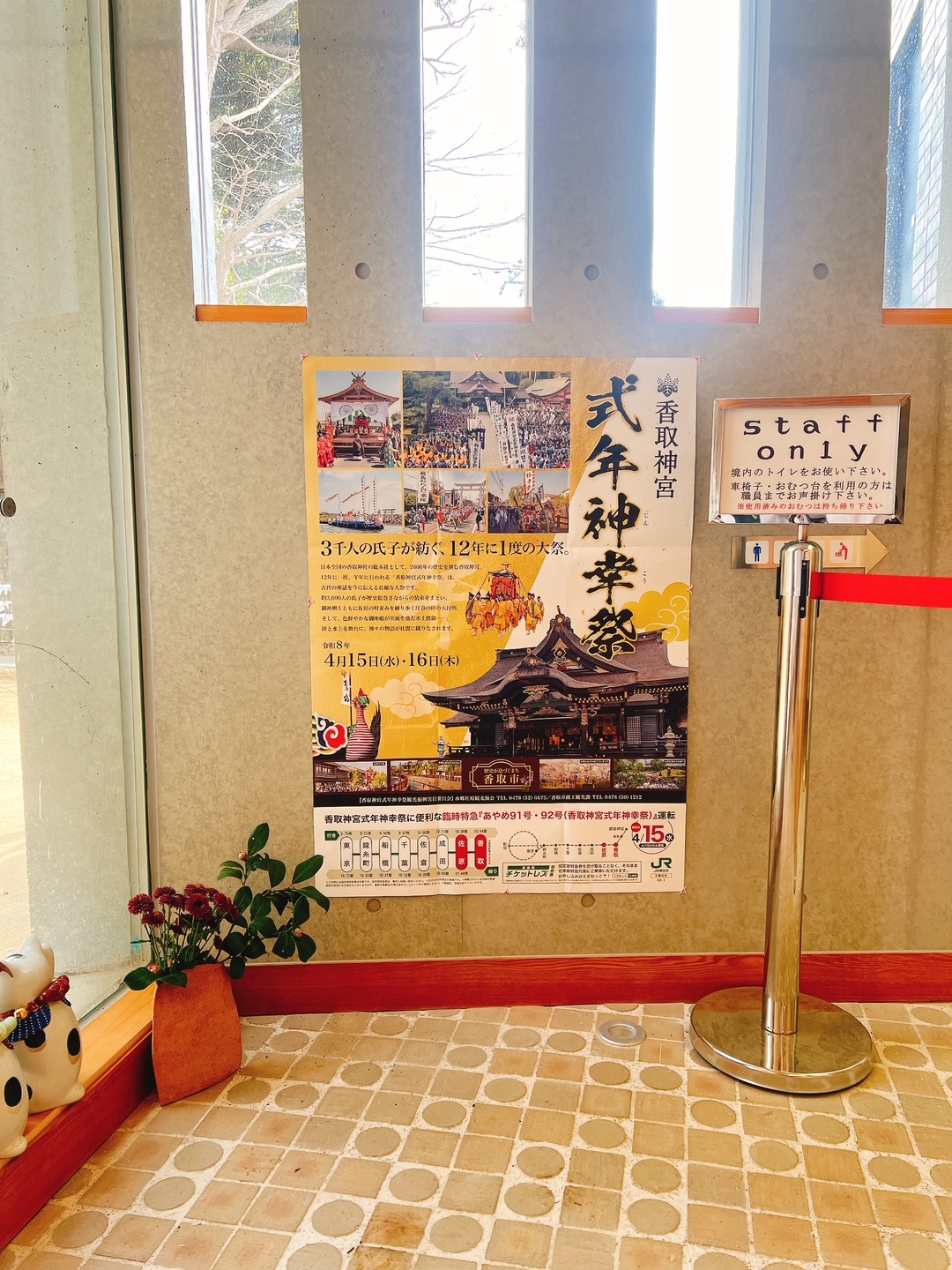 そう言えばのお話なのですが、プロ野球が開幕していたんですね。年度末とイベント続きで、その事が全く頭に入っておりませんでした。 以前は週3回も幕張のマリンスタジアムに観戦をしに行っていたことを思うと、何故にプロ野球熱が下がってしまったのか?? でもね、千葉ロッテマリーンズが勝つと嬉しいのは変わりませんで、開幕から昨日前の三連戦で2勝1敗と、それなりに良いペースで来ております。 首位のソフトバンクホークスは3連勝と、やはり強いですね。このチームはマリーンズと違いそのままの勢いで終盤まで行くから、今年もか!?と。 さて、今日の宮司ですが、午前中に月末恒例の支払いなどを行なうために、金融機関で振込作業をしてきました。 とある金融機関では、通帳からであれば振込用紙に記入をせずとも、カウンターに設置してあるタブレットを使って振込が出来るようになりました。 金融機関の用紙って基本、誤字があった場合などは修正が効かず、新たに書かなければなりません。 ヘンなところに緊張しいの宮司。金額が大きいと手が震えまして、この手のミスをやらかすのです・苦笑 特に今日は新社務所建設関連の支払いを行なう重要な日でしたので、振り込む額も宮司の人生の中では一番多く、窓口のおねえさんと一つ一つ確認をしながら無事に送金完了。 ホッとしたところにあって、御浄財を奉賛頂いた方々に改めて感謝をしたく存じます。 昼前に帰社すると智勇権禰宜が袴姿から背広姿に改服。今日は午後から千葉県神社庁研修所主催の教養研修会がありまして、そちらへ参加のために出掛けていきました。 今回のテーマは「香取神宮式年神幸祭について」で、12年一度の午年に行なわれる香取神宮第一の重儀について学びます。 香取神宮は延喜式神名帳に記載されている3つの神宮の一つで、毎年4月14日の例祭には天皇陛下の勅使が正服姿で6年に一度参向。 その他の年も陛下のお使いがモーニング姿で参向するなど、皇室の御崇敬も厚いお宮なのです。 例祭の翌日15日には神幸祭が執り行われ、鳳輦にお乗りになった香取の神様が神宮より宮下の駐車場まで渡御。ここで駐輦祭が行なわれ、年番の氏子町より神楽などが奉納されます。 12年毎の午年には式年神幸祭として供奉者3000人以上の大行列が仕立てられ、鳳輦は御座船に乗り利根川を上り、佐原河岸に上陸をして御旅所にて1拍。 翌16日に佐原市街を回り、再び香取神宮に戻ってくるという、それはそれは壮大華麗な行事であります。 宮司は6歳の時に稚児で上がって以来、今回で5回目の奉仕で、智勇権禰宜は同じく6歳の稚児から始まって今回で3回目の奉仕となります。 今日は香取神宮より佐川・曽川両権禰宜が講師としてお話をして頂くので、智勇権禰宜も楽しみしておりました。 宮司も受講したのは山々なのですが、社務の都合上でお留守番部隊。智勇権禰宜から送られてく画像を見て自己研鑽をしております。 その画像の中には陛下からの御幣物が収められている柳筥(やないばこ)と五色の布が写っており、香取神宮当局の研修会におけるご理解とご協力に、神社庁研修所の訓育主任として感謝を致します。 外が若干風が出てきたようです。明日は春の嵐かもと天気予報が流れておりまして、花散らしにならなければ良いですね。 ・香取神宮 https://katori-jingu.or.jp/ |