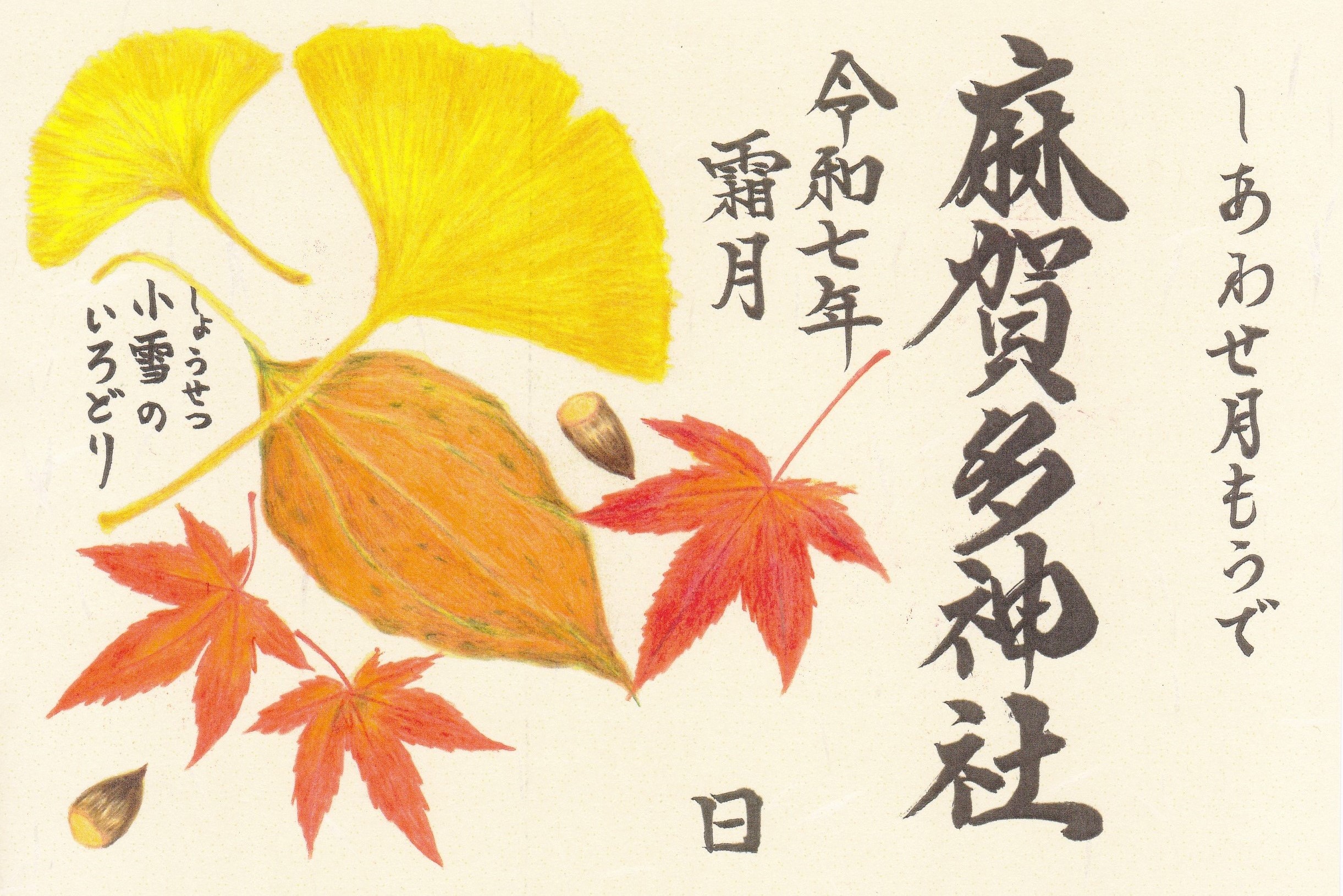 霜月の「しあわせ月もうで」は 小雪の 風に吹かれて 色さやか です。 四季の移ろいが素敵な私達の日本。 その四季も気候変動により二季になるのではと言われております。 しかし乍ら、四季それぞれの彩りの美しさは健在です。 二十四節気で11月22日あたりは「小雪・しょうせつ」といって、雪の降り始める頃とされます。 その冷たい風に吹かれ、境内の木々も緑から色とりどりに変わっていく。 その移ろいをお楽しみ下さい。  |