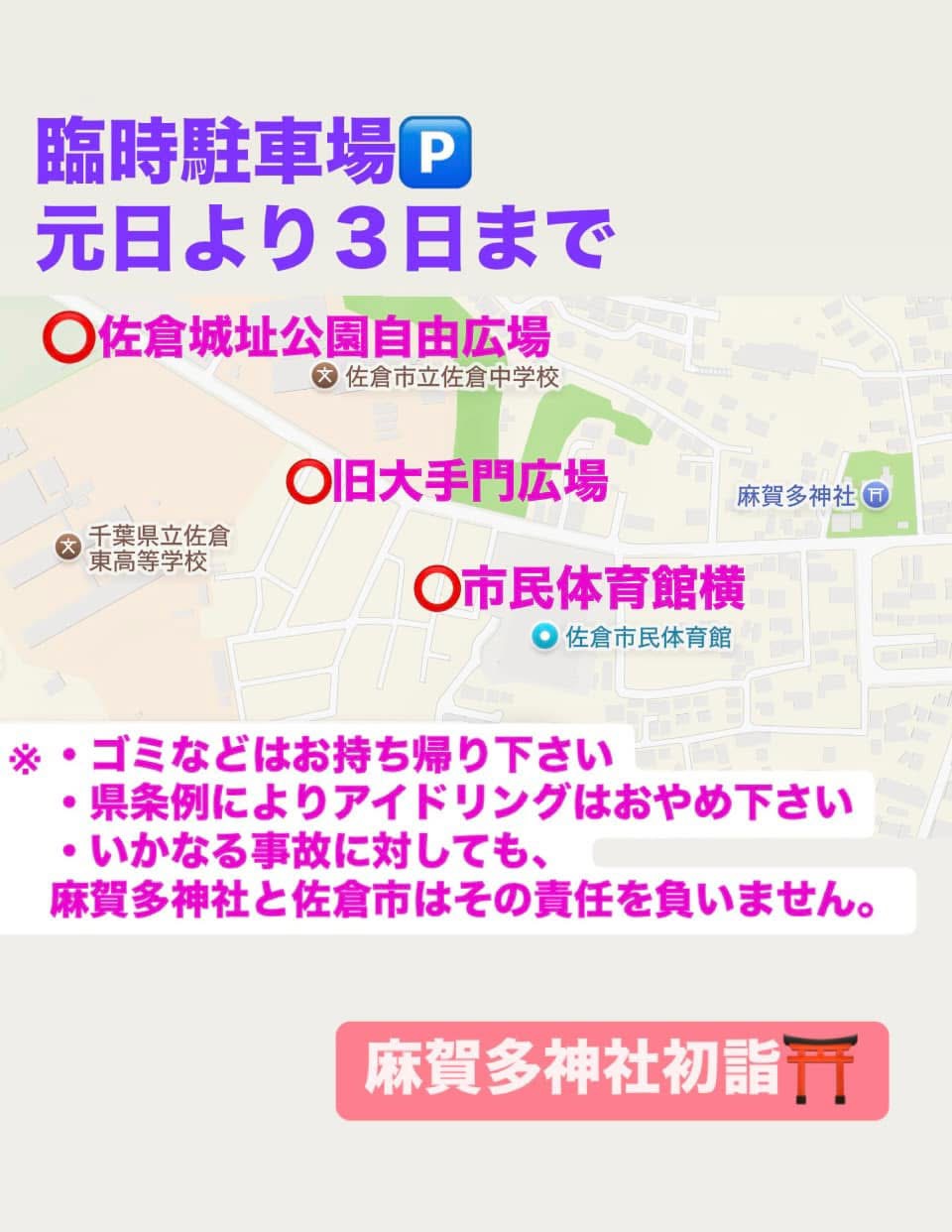 お正月三が日の駐車場は常に満車状態となりますので、下記の臨時駐車場をご利用ください。 尚、地域振興対策により佐倉市より借り受けておりますので、ご協力をお願い致します。 令和8年1月1〜3日 ・佐倉市民体育館横駐車場 ・旧大手門広場駐車場 ・佐倉城址公園自由広場 ※駐車場内での事故や盗難に関しては、麻賀多神社と佐倉市はその責任を負いません。 千葉県条例により、アイドリングはしないで下さい。 駐車場内では空ふかしや騒音は立てないでください。 |