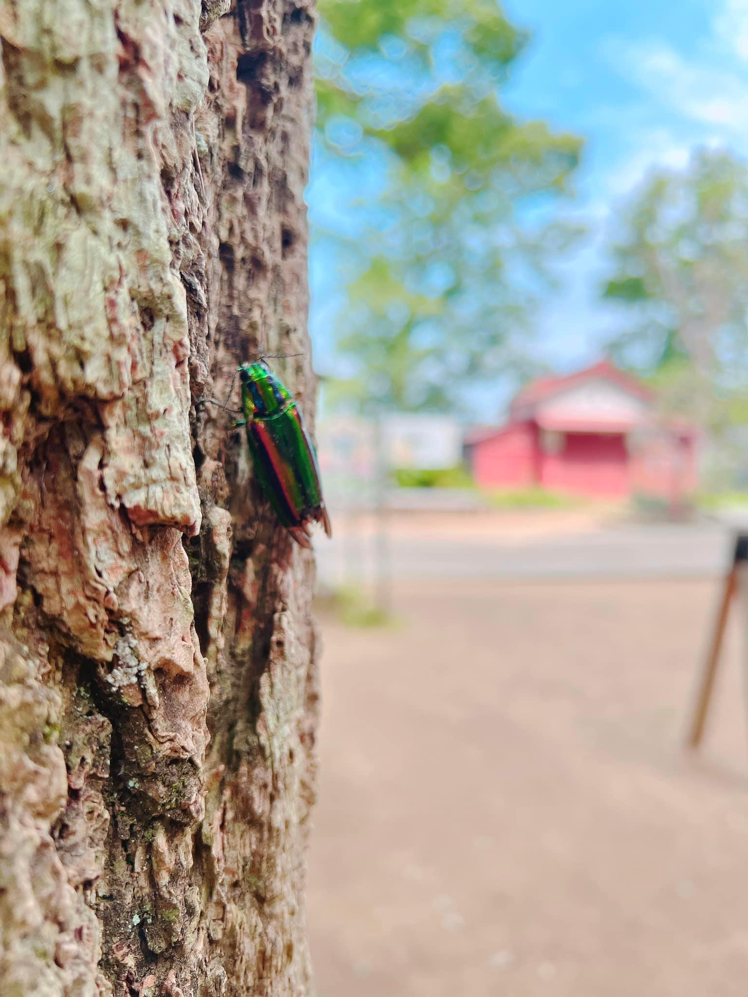 ついに猛暑日となる予報が出た佐倉です。当地は夏暑く冬が寒いと言われますが、神社の辺りは筑波山からの風、通称「筑波颪・;つくばおろし」が入ってくるので、とてつもなく暑いっていう日は少なかった。 はずなんですが、ご多分員漏れず世間一般並みになって来ております。 それでも境内は神社前の道路、大手通よりも3〜5度低い場所も有りまして、やっぱり麻賀多様は涼しいねとの話し声も聞こえます。 一昨日からですが、境内各所に風鈴を吊しました。金属製のものとガラス製の2種類。 金属製はち〜んと長く響くタイプで、ガラス製のものはチリンチリン、カランカランといった感じで、それぞれの特性が表れていますね。 暑いとは言え、社務所内だけで仕事になるわけもなく、外作業も結構あるんです。 境内に風鈴を吊していたときのことだと思いますが、今年も玉虫を見つけることが出来ました。 なんと今年の玉虫は生きている状態で、なぜかお腹を上にして転がっておりました。 可哀想なので近くの銀杏の幹に捉まらせてあげると、暫くそのままじっとしておりました。 玉虫と言えば、去年も書きましたが法隆寺にある玉虫厨子ですね。厨子の壁面に玉虫の羽が敷き詰められていたという、あれです。 以前、法隆寺の宝物殿で実物を見ましたが、長い年月を経て玉虫の羽は取れておりますが、これに玉虫色に光る羽が付いていたらどれだけ綺麗なんだろうと想像しました。 日本では北海道以外に生息している玉虫、暑さに強く動きは機敏で、警戒心が強いそうです。 それを鑑みると、境内で見つけた玉虫はそろそろと言う感じだったのでしょうか。 玉虫は榎や欅の樹皮の割れ目や傷が付いたところに卵を産む、孵化した幼虫は幹に入り込んで、それを餌に成長します。 なので、果樹農家などでは害虫扱いなんですよね。難しいところです。 当社も境内に数本の欅があるので、多分そこのどこかで成虫になったものが出てきているんだと思います。 俗信として、玉虫の羽を箪笥に入れておくと着物が増えると言われました。 今はその箪笥自体も少なくなりましたが、お洒落に気遣う乙女子頃は変わらないといったところでしょう。 さて、この炎天下ですが、宮司はこれから御例祭に使う提灯の張り替え依頼に、浅草まで出向いてきます。 帰りには冷えた美味しいものでも、喉ごし良くご褒美を頂くとしましょうか。